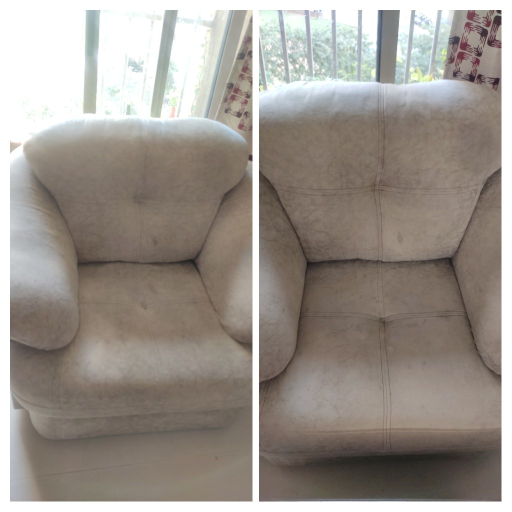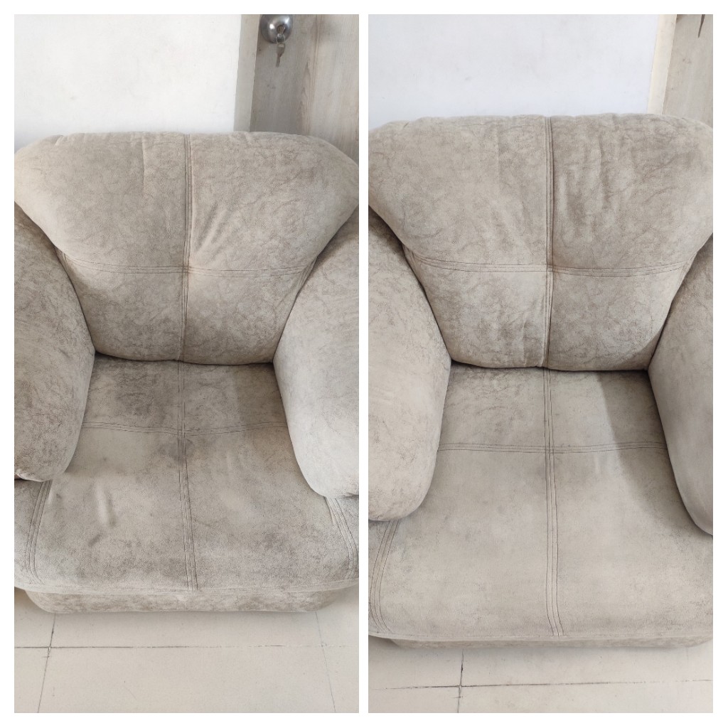 Dry Vacuuming of sofa to remove dust. Eco friendly Fabric Shampoo treatment to sofa. Use suede brush to remove surface dirt, dust & Remove the spots. Drying the sofa using High suction Vacuum cleaner. For sofas & chairs that are upholstered with leather, we perform a treatment using leather cleaning cream. Remove the Oil stains on sofa.